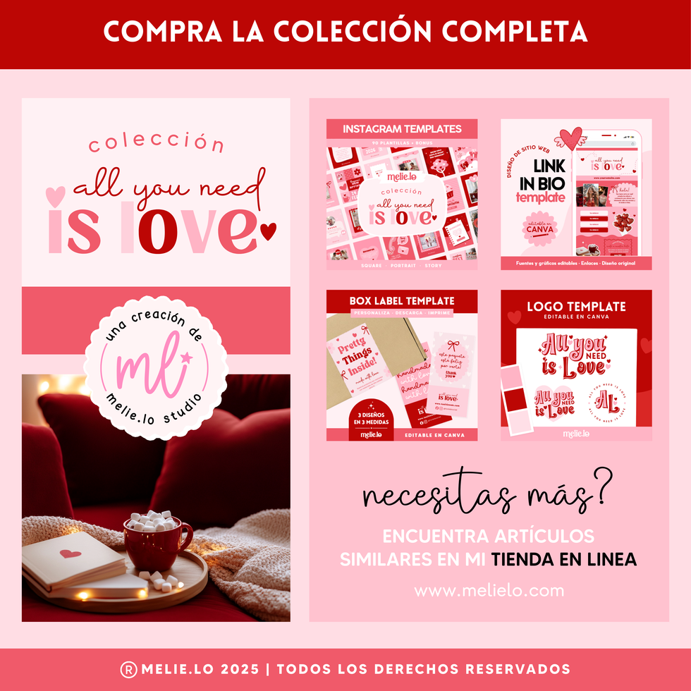 Este San Valentín, celebra el amor con diseños que tocan el corazón. Mi nueva colección de plantillas All You Need Is Love, está inspirada en los momentos tiernos y reales de la vida diaria, utilizando una paleta de colores romántica (rojos, rosas y blancos). Perfectas para Instagram y redes sociales.