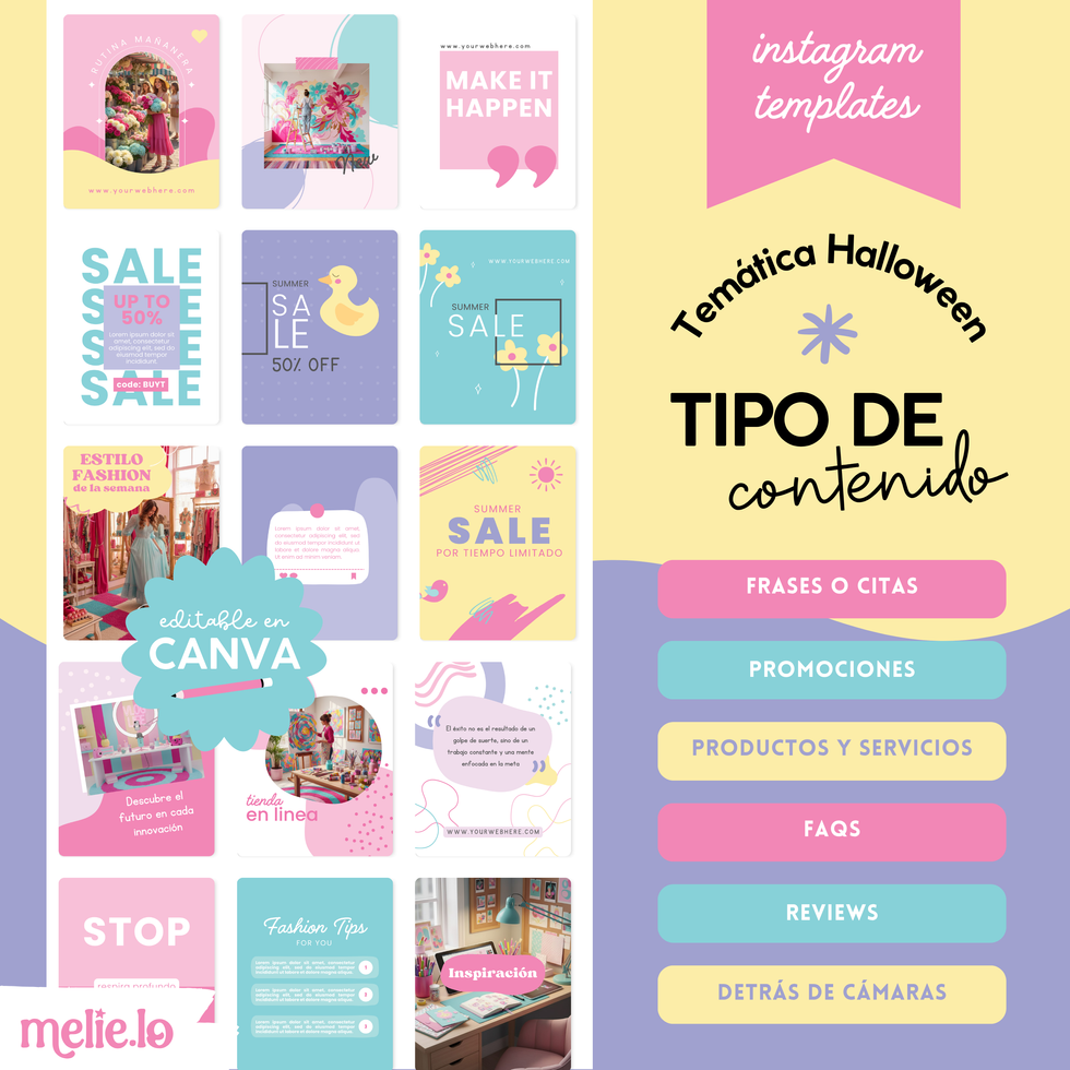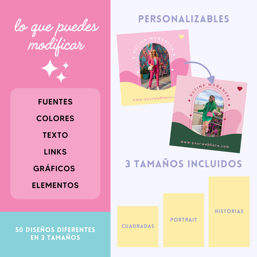 50 diseños diferentes en 3 tamaños: Cuadrada, Portrait (ajustadas a la cuadrícula) e Historia.