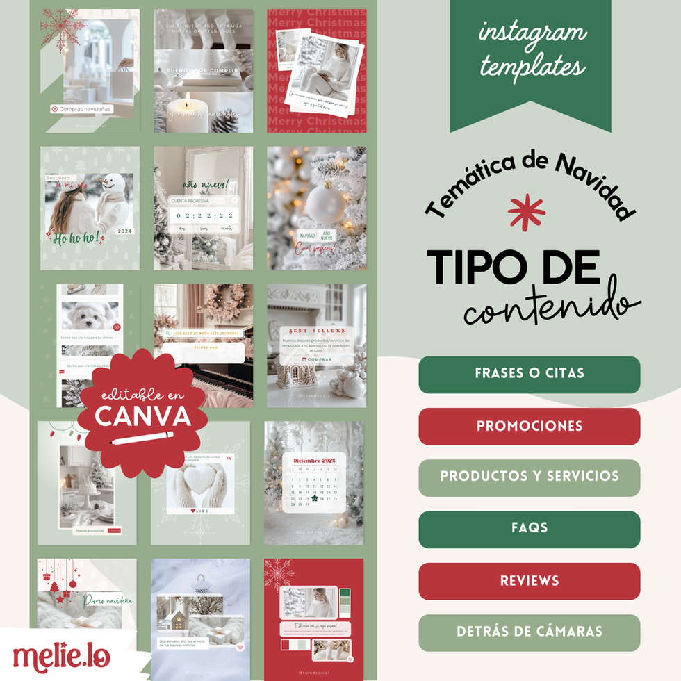 Kit de plantillas para Instagram de la colección Jingle Bells, ideal para comenzar a crear publicaciones llamativas y profesionales en redes sociales en temporada Navideña.