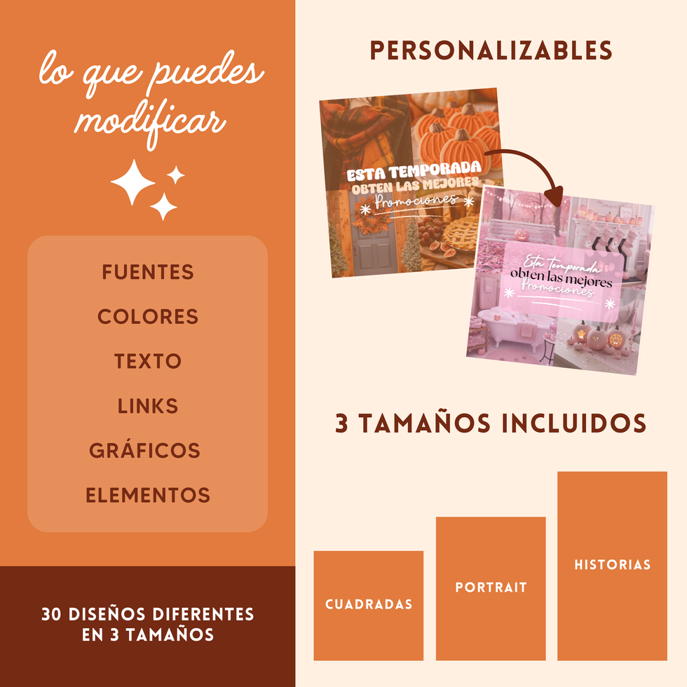 30 diseños diferentes en 3 tamaños: Cuadrada, Portrait (ajustadas a la cuadrícula) e Historia.